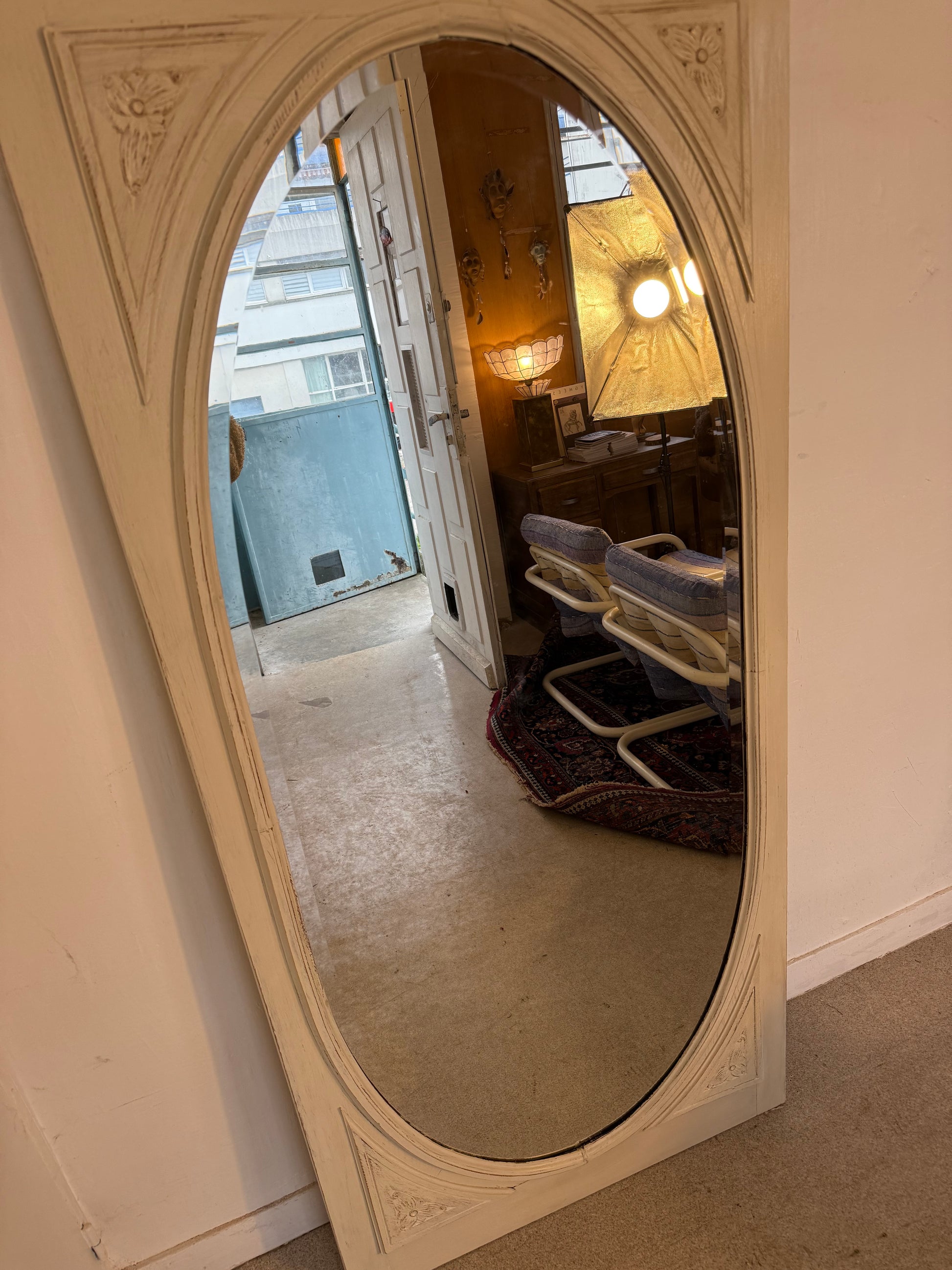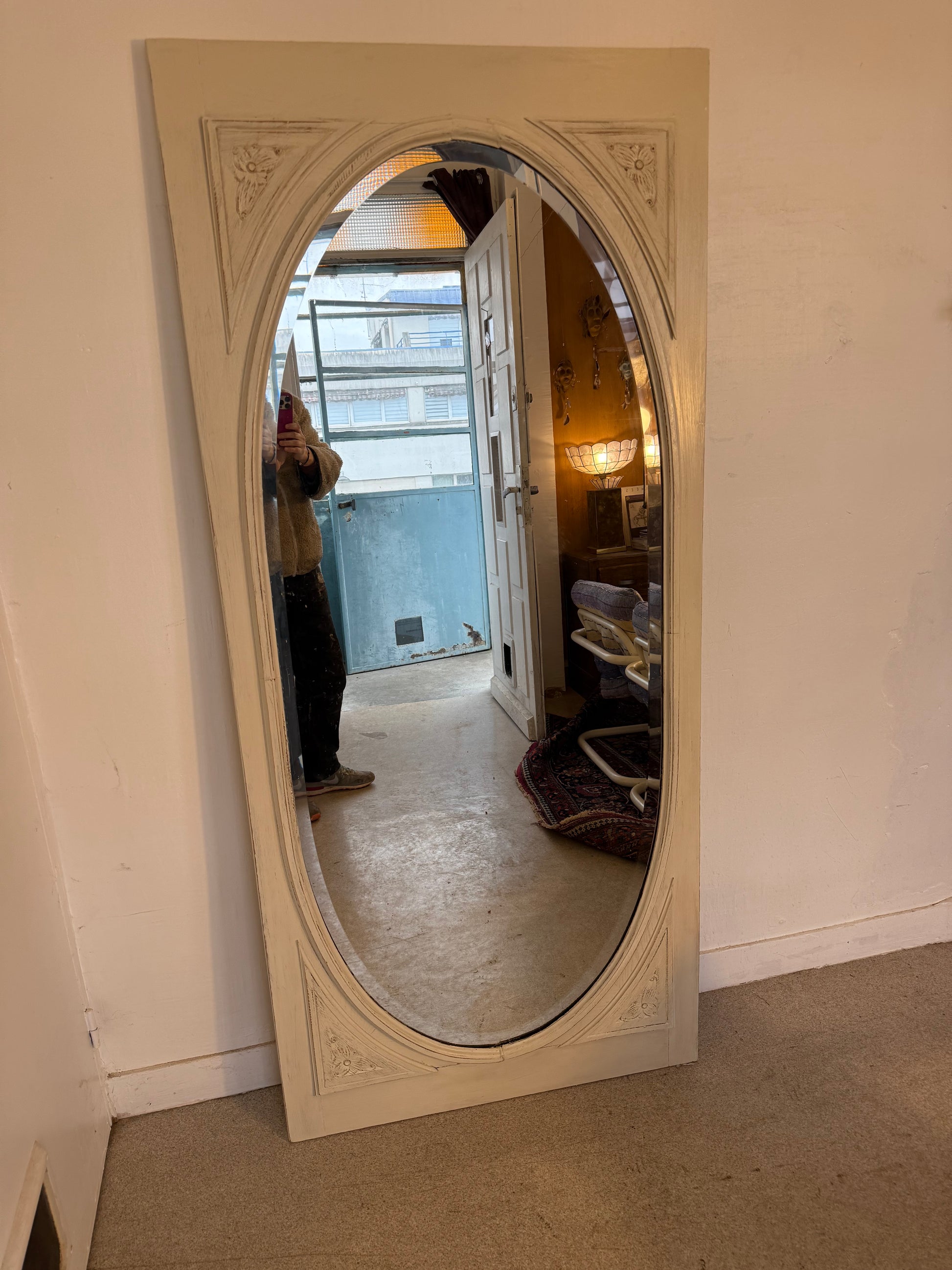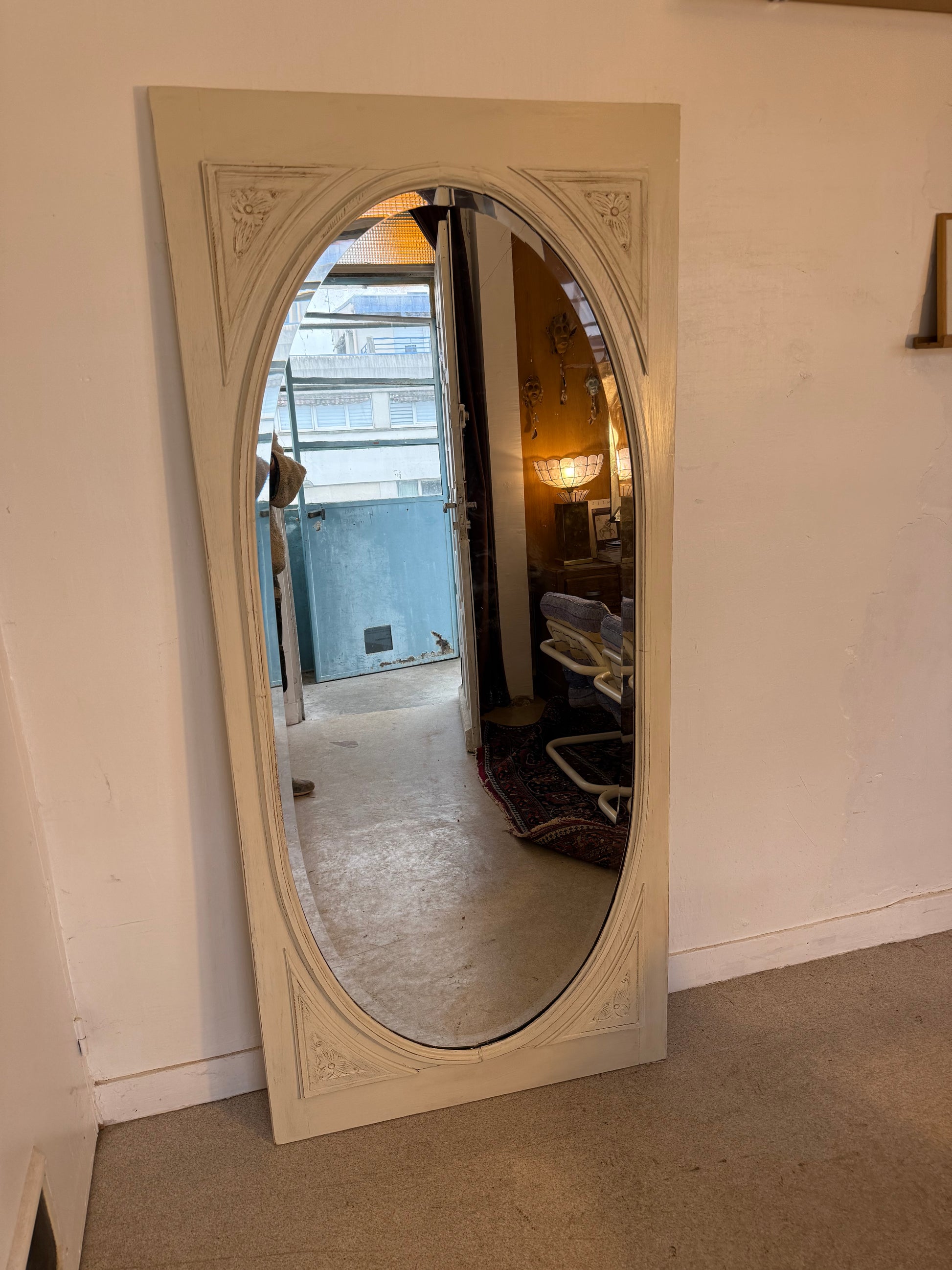 Grand miroir blanc patiné art déco avec sa glace ovale biseautée