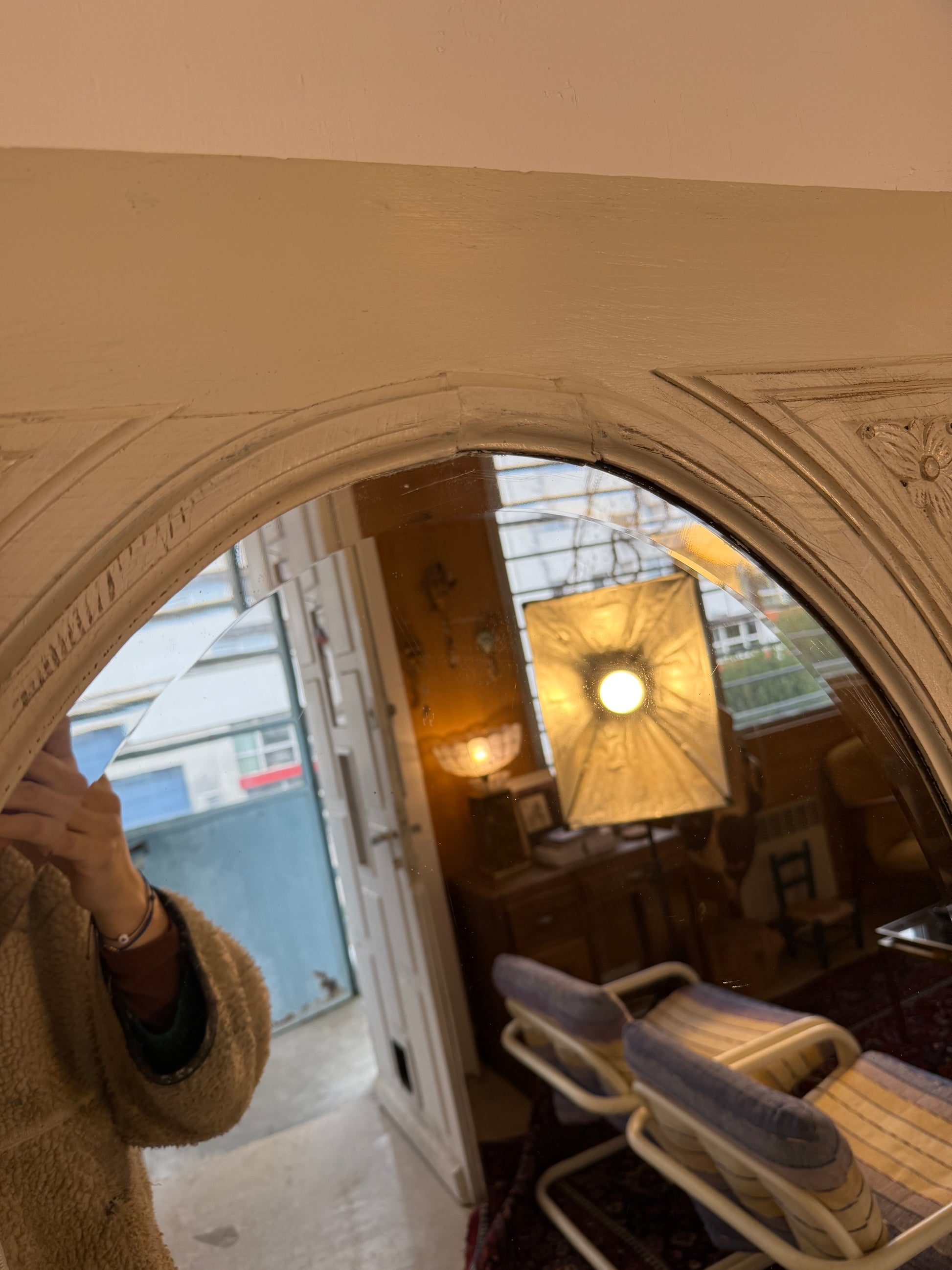 Structure en bois lourde de style art déco. Jolie patine blanche. Idéal pour se voir entièrement.