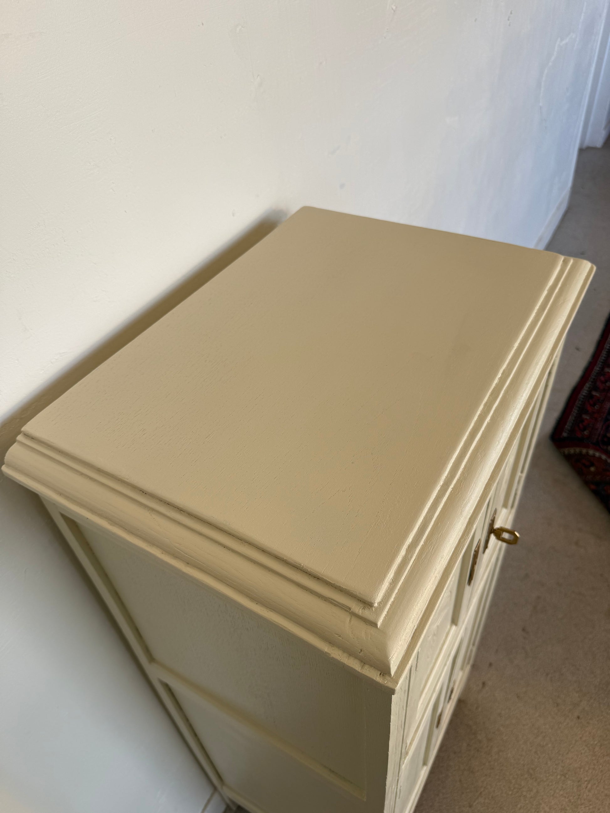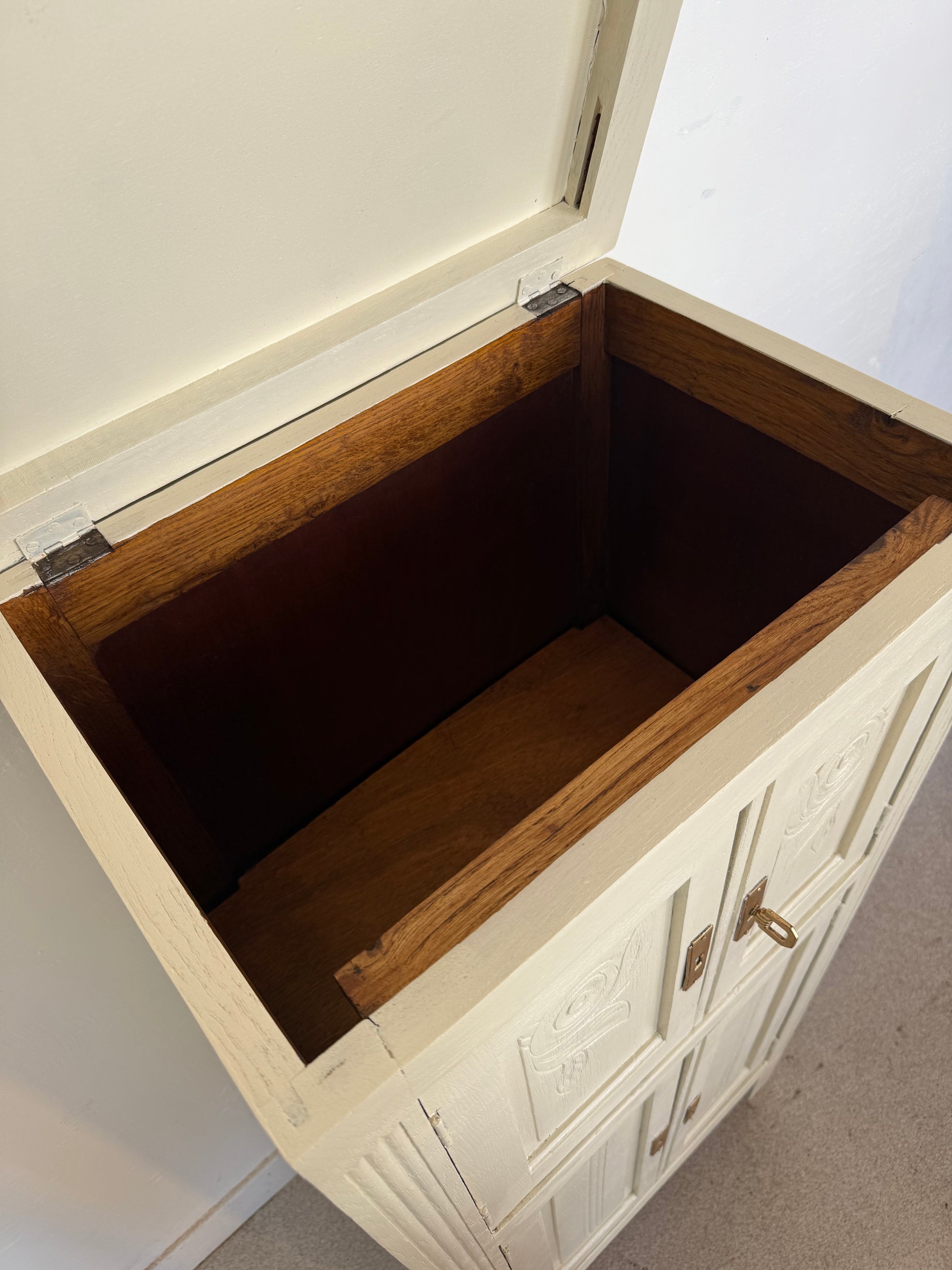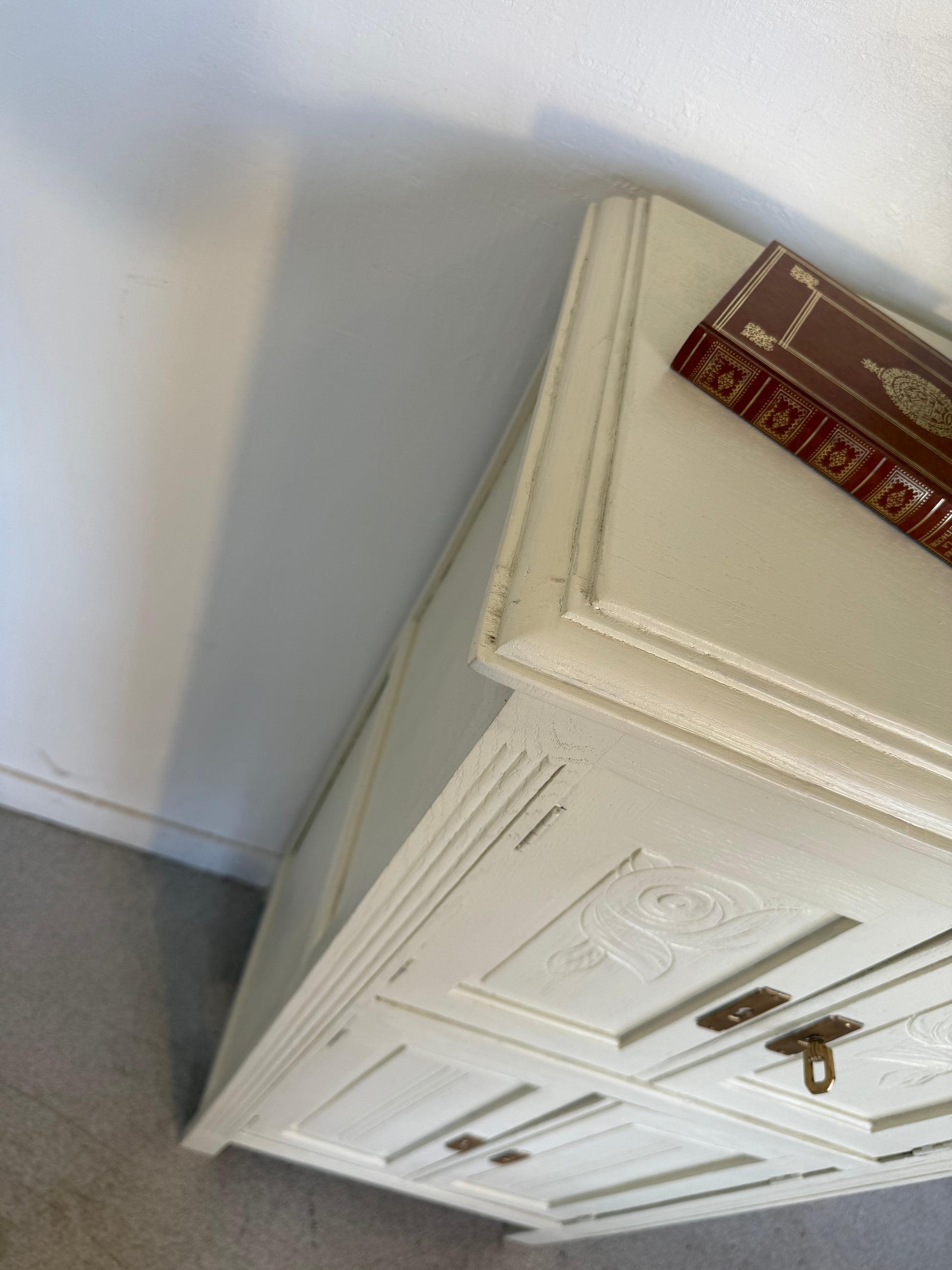 Le meuble a été entièrement poncé, peint dans un blanc crème d’une peinture qualitative (A+ anovabois) et l’intérieur nettoyé et nourri