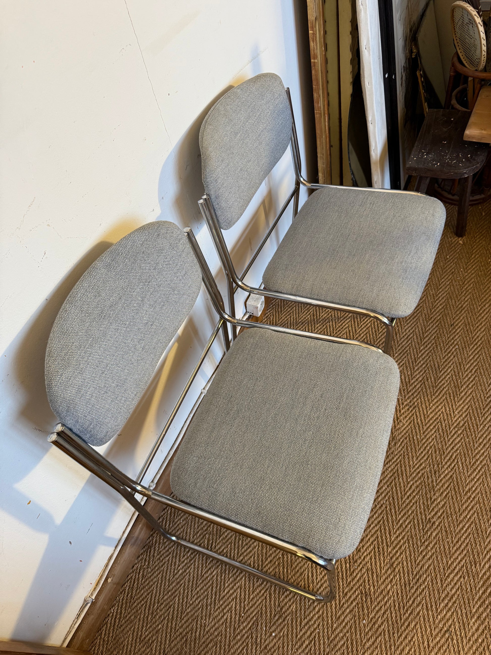 Très jolie paire de chaises vintage en chrome et tissu moucheté bleu gris