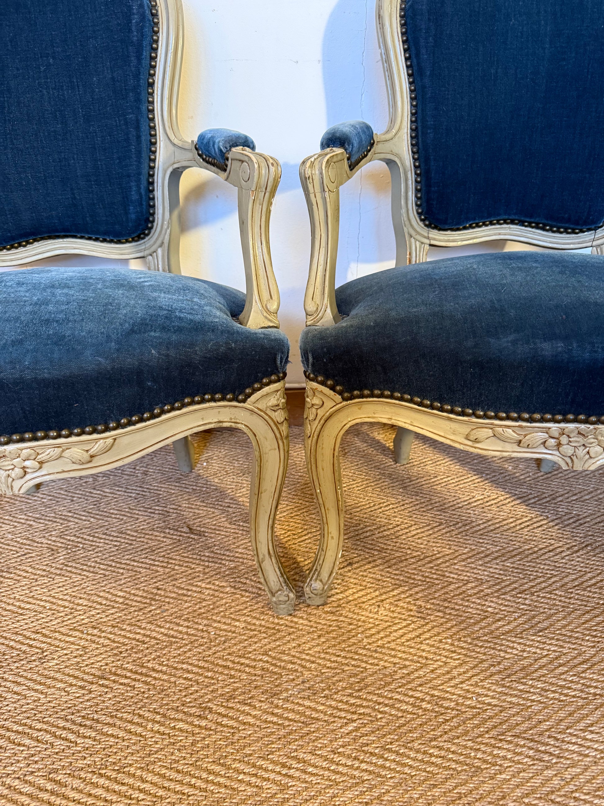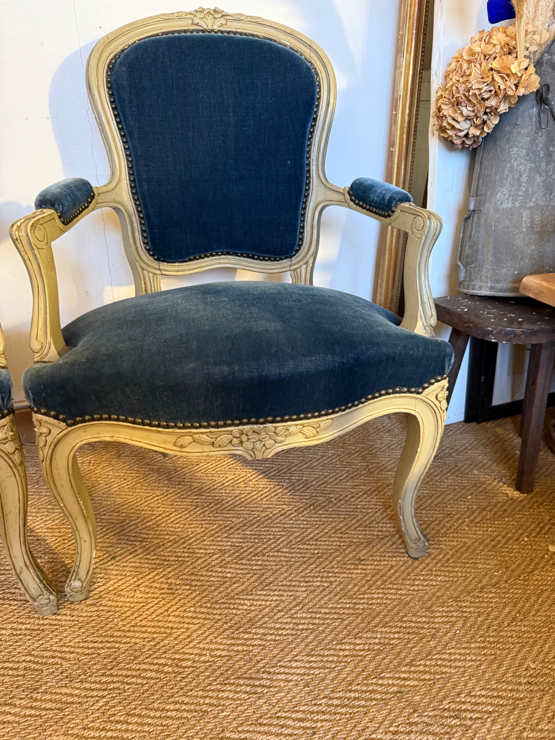 Très jolie paire de fauteuils cabriolet style Louis XV anciens en velours avec un beau bois patiné gris clair