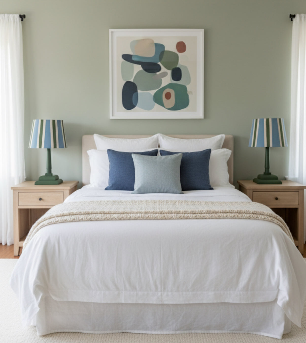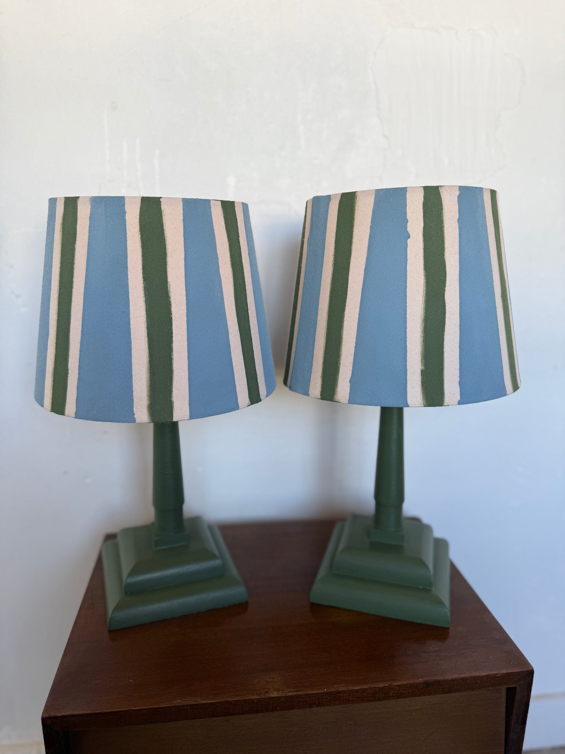 Le pied a été peint dans un joli vert olive et l’abat jour rayé a également été peint à la main (rayures irrégulières)