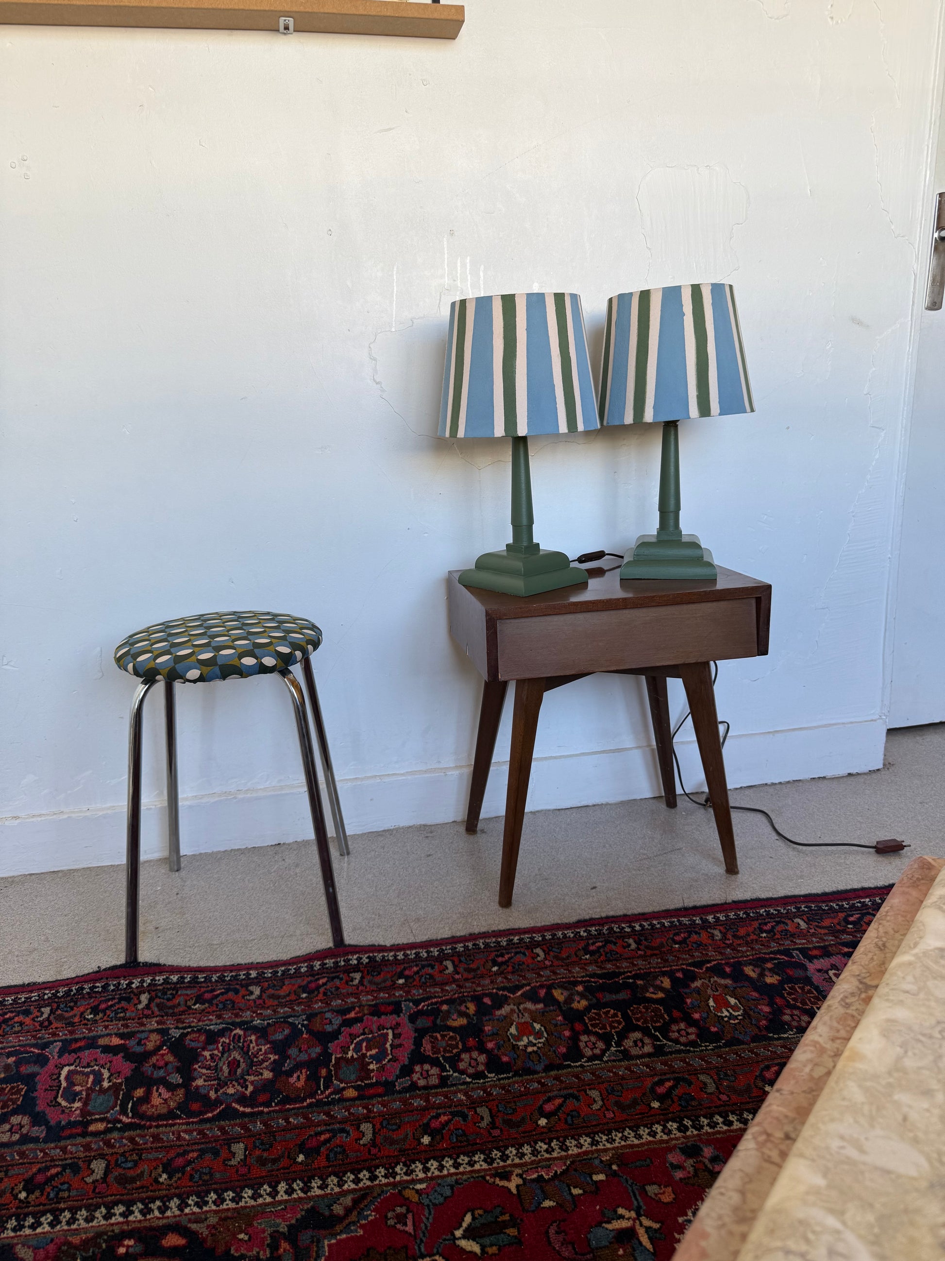 Paire de lampes vintage en bois avec leur abat jour rayé beige bleu et vert