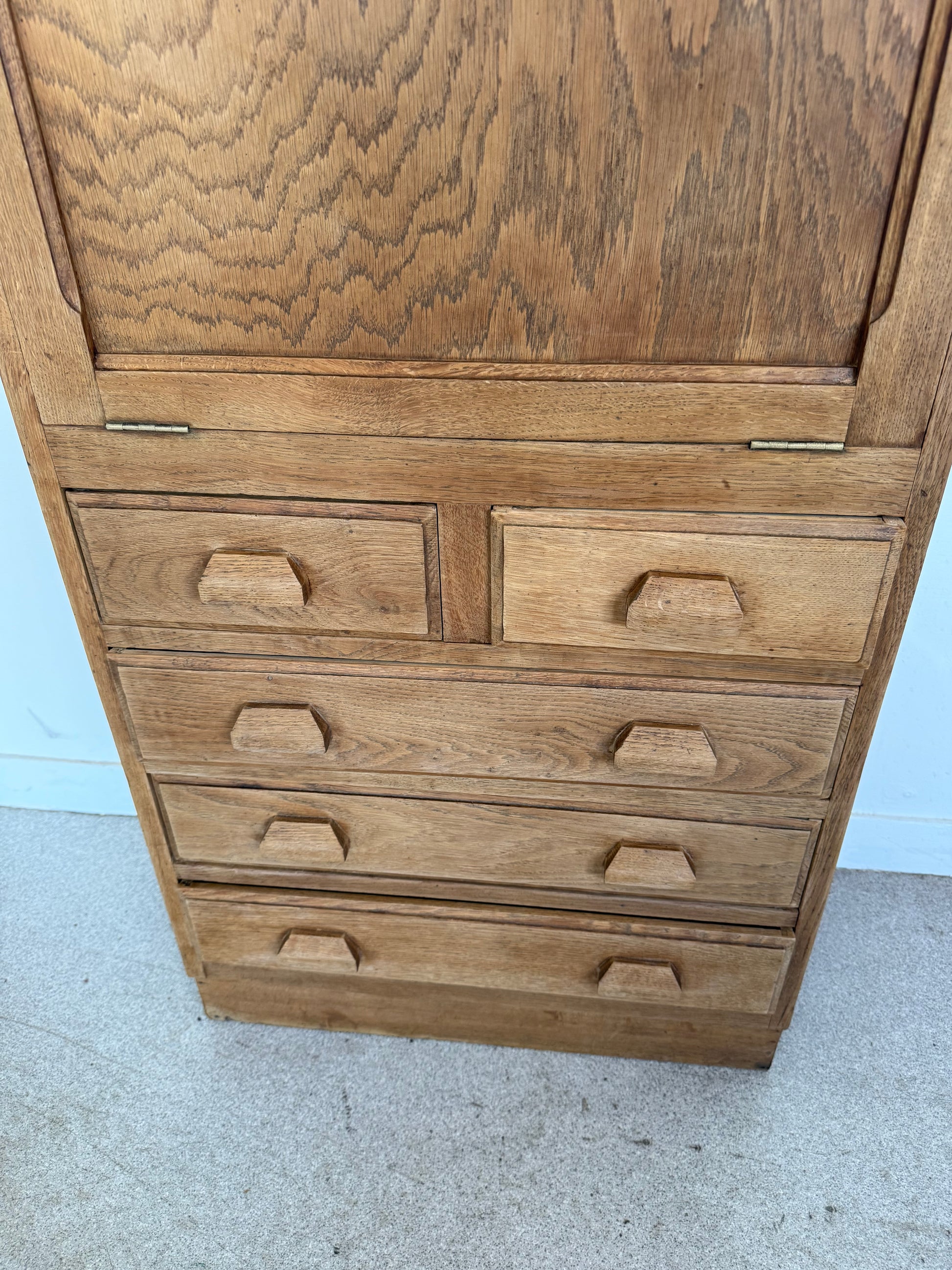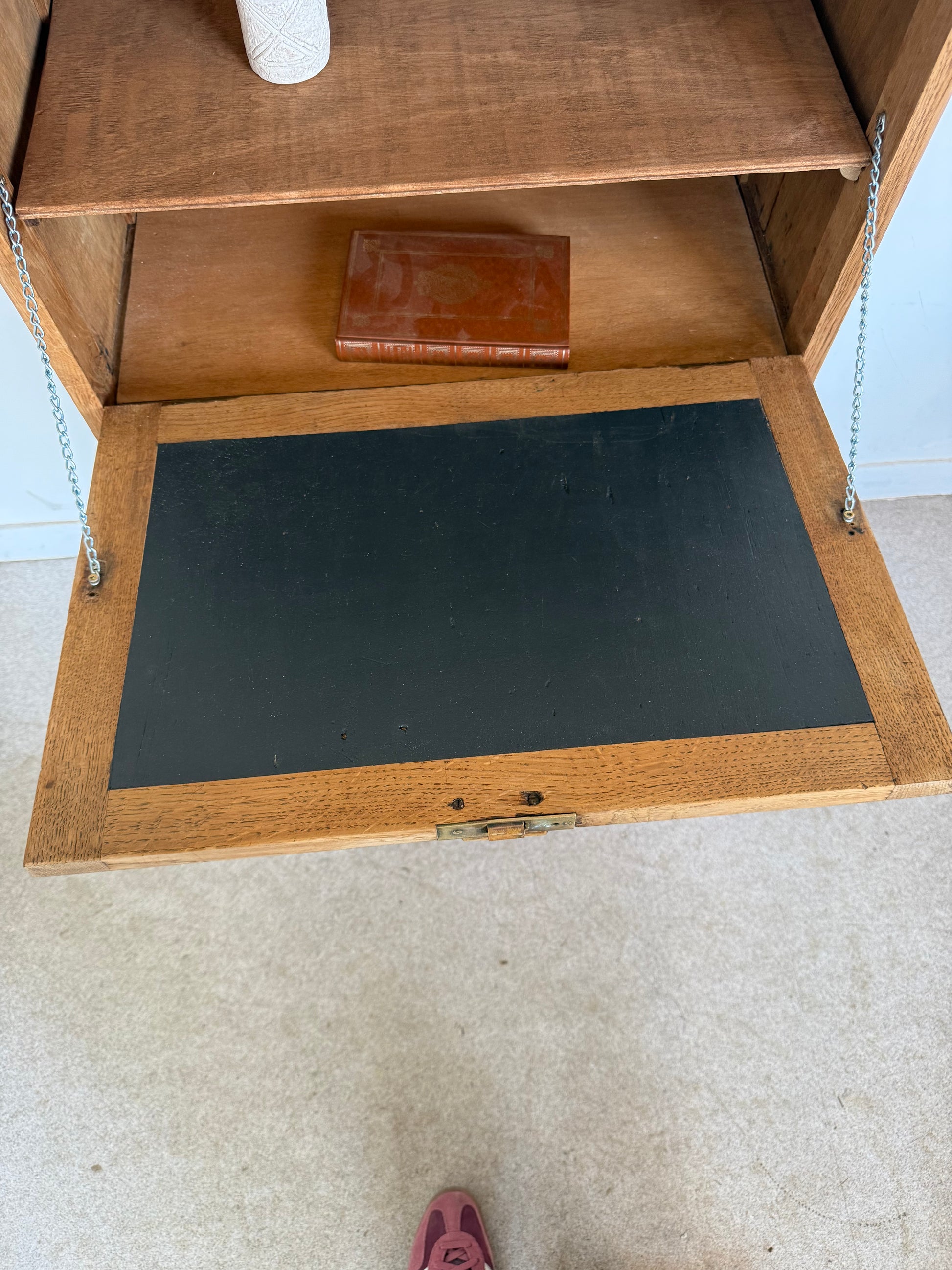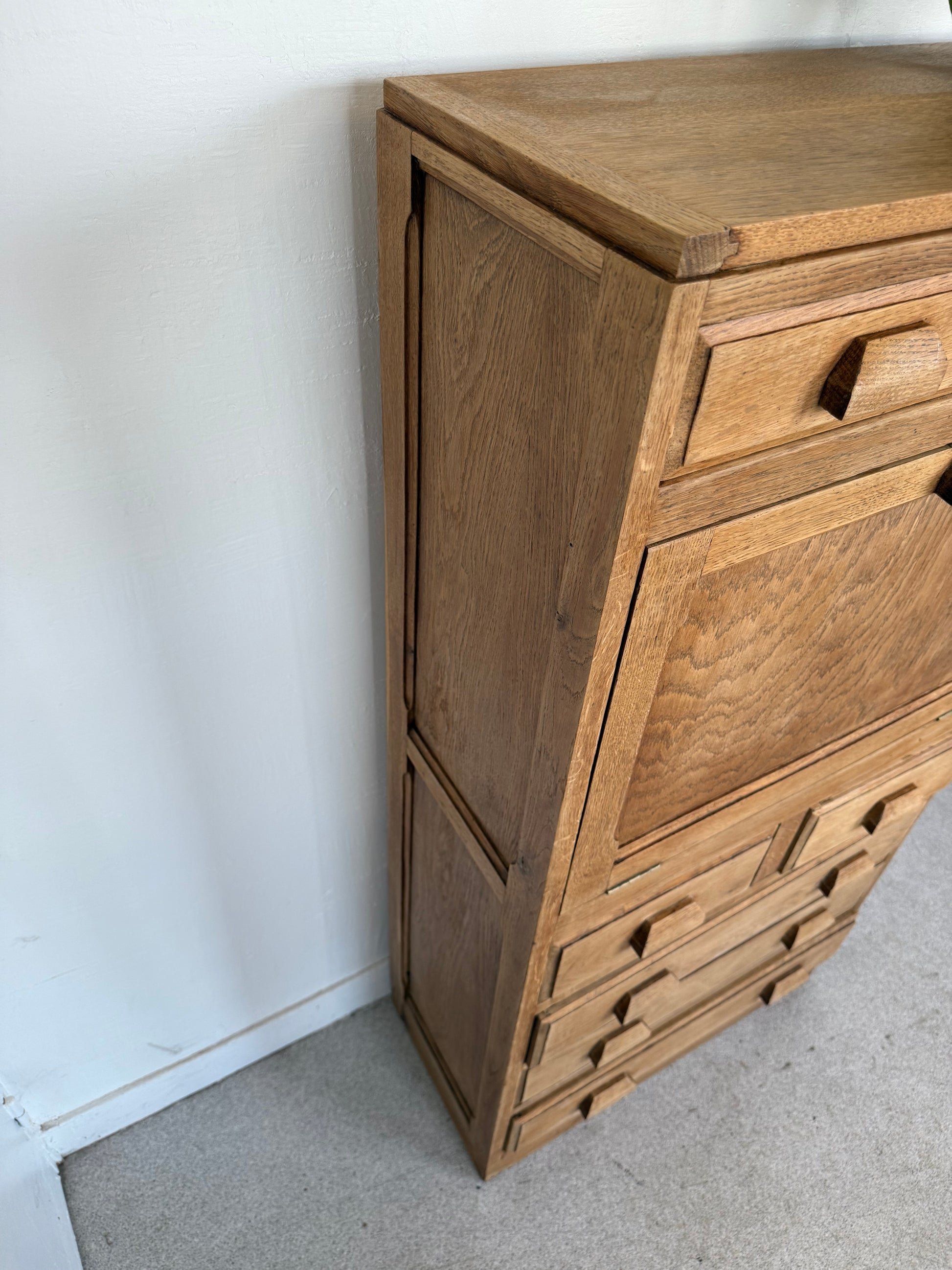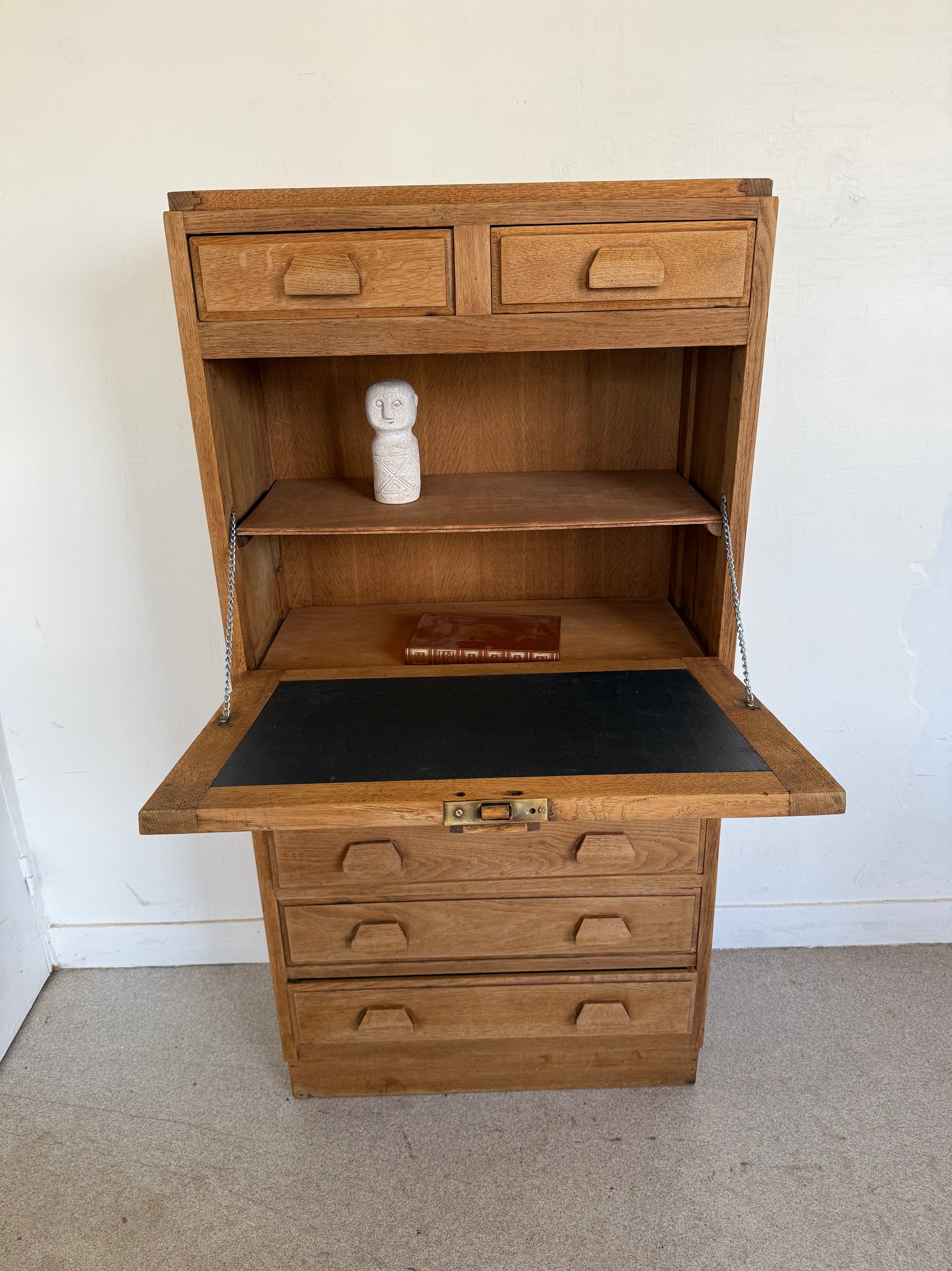 Très joli secrétaire vintage en chêne entièrement restauré. Peut faire office de meuble de rangement dans un salon, une entrée, une chambre.