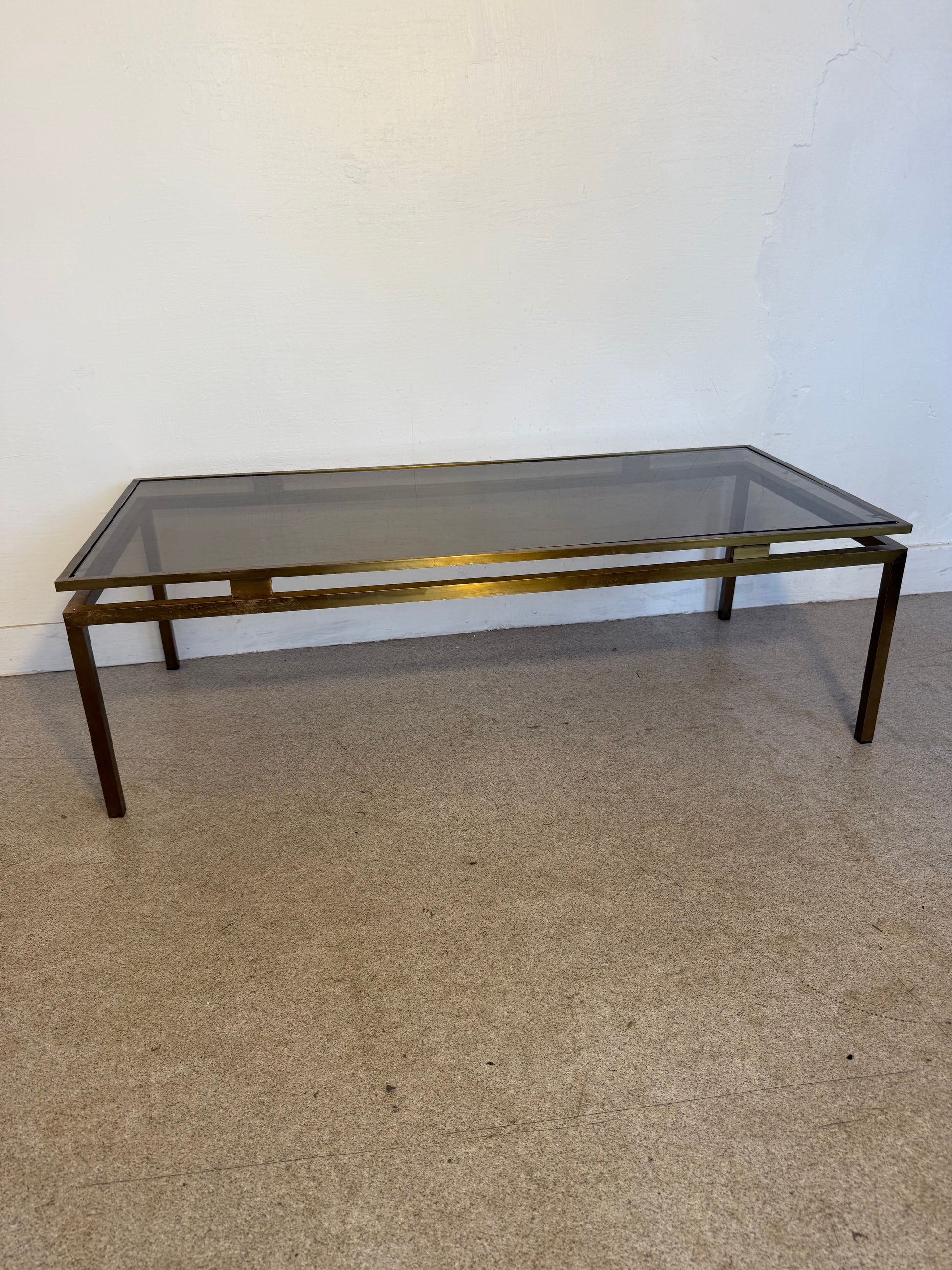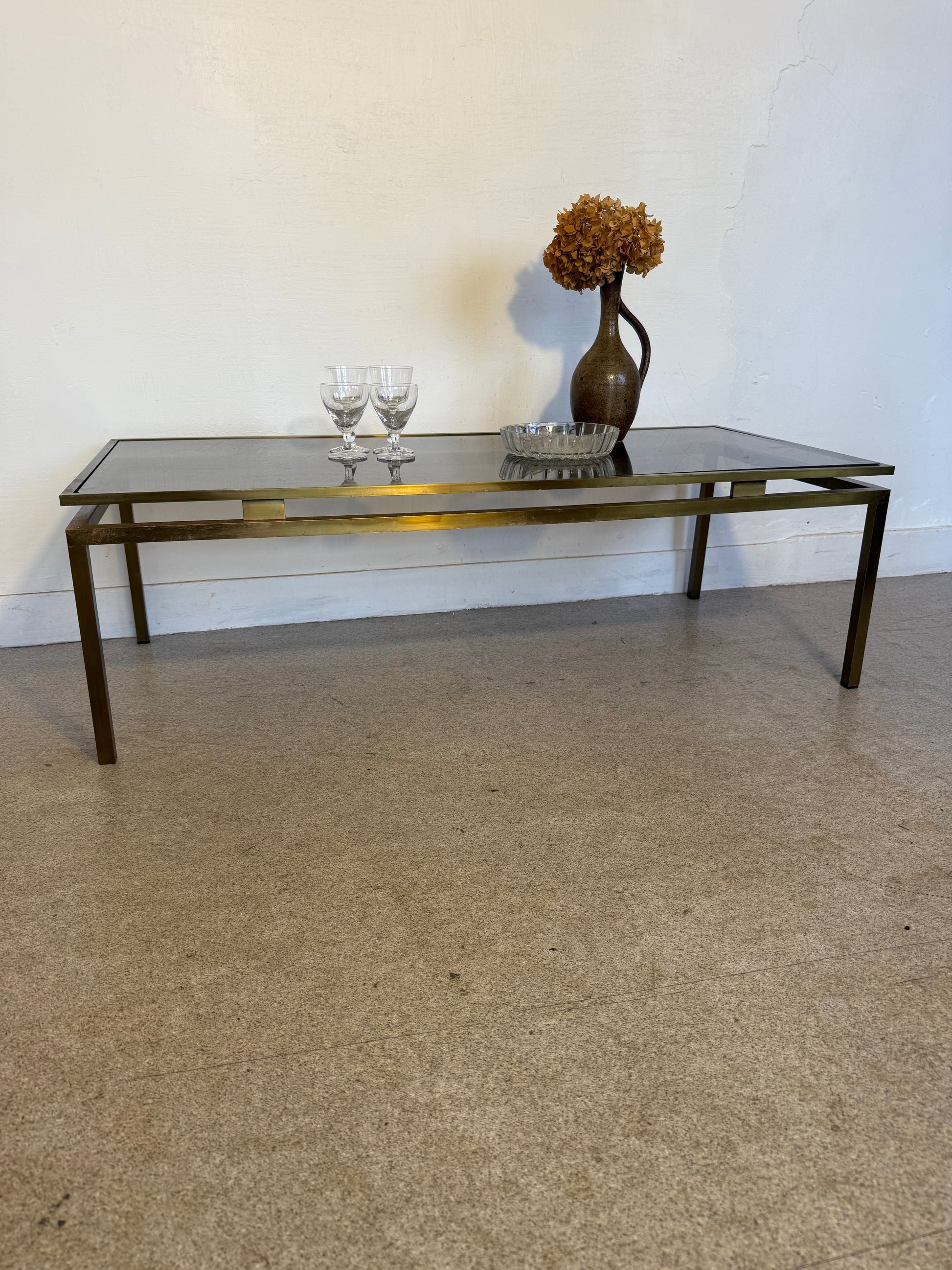 Belle table basse vintage en laiton et verre fumé