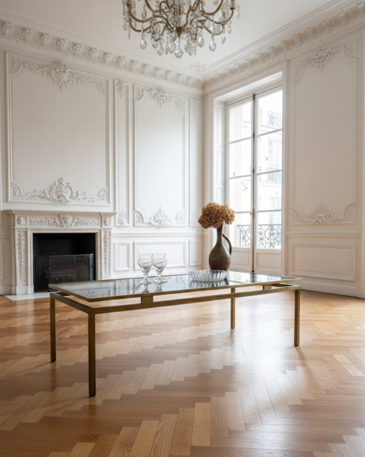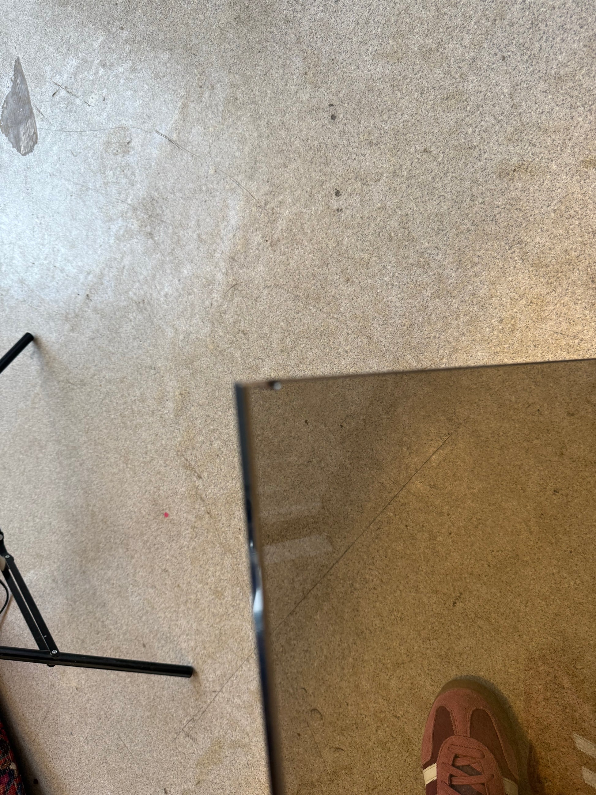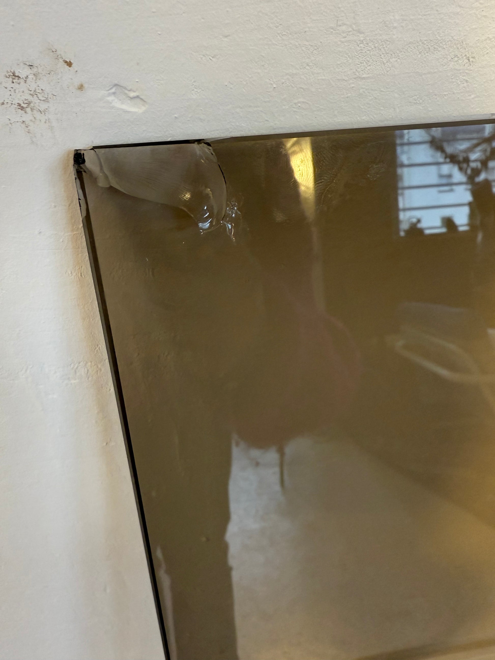 La table présente une jolie patine dorée avec des petites zones d'oxydation lui donnant du charme. Le verre présente 2 défauts : un angle abimé d'un côté mais non visible une fois le verre posé, un autre angle plus abimé mais peu notable une fois le verre posé (cf photos).