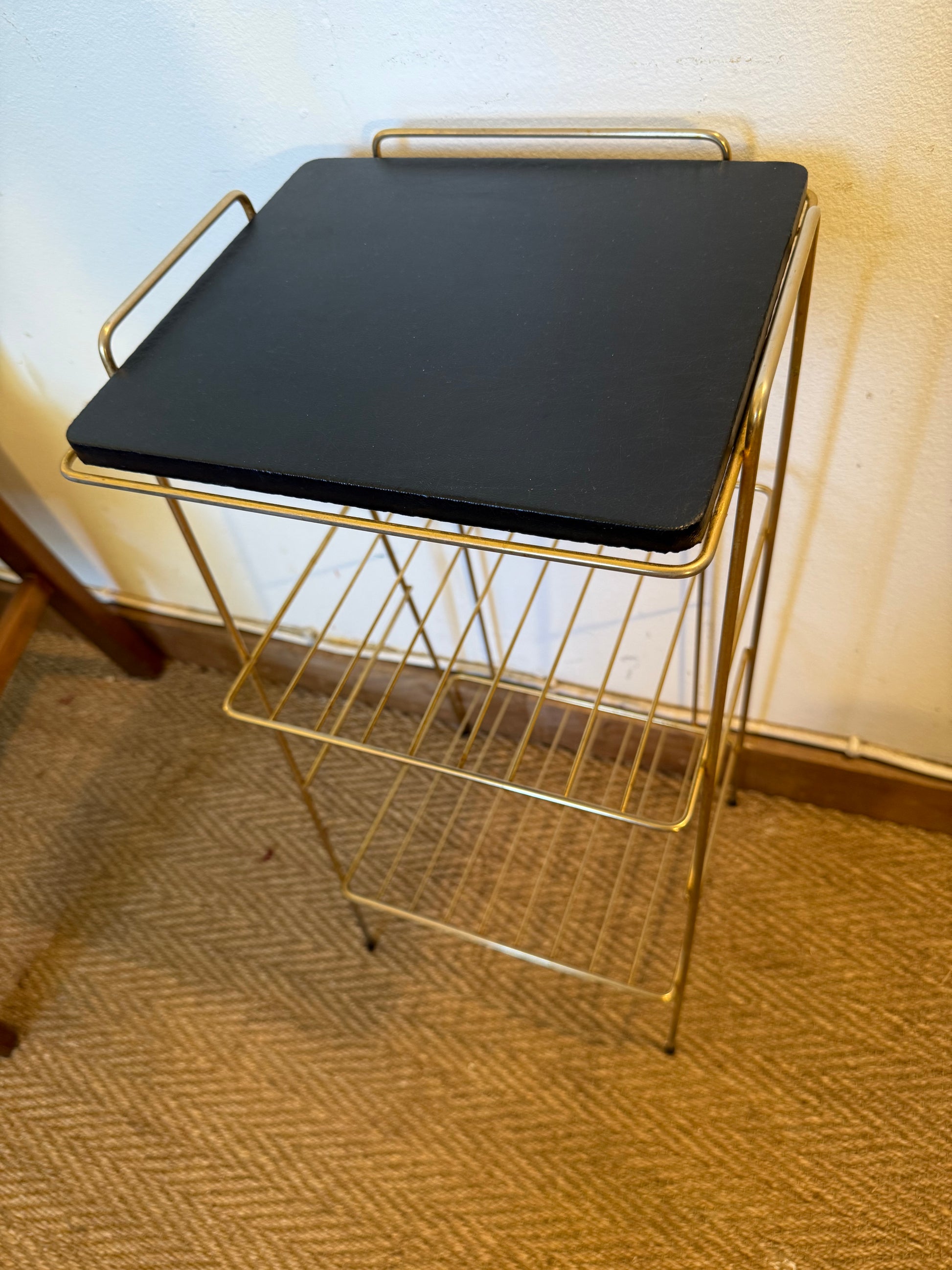 Joli petit meuble d'appoint en laiton doré et tablette supérieure en skaï noir